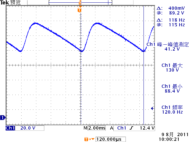 低頻紋波是與輸出電路的濾波電容容量相關(guān)。由于開(kāi)關(guān)電源體積的限制,電解電容的容量不可能無(wú)限制地增加,導(dǎo)致輸出低頻紋波的殘留,該輸出紋波頻率隨整流電路方式的不同而不同。