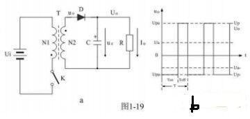 1-19-a是反激式變壓器開關電源的簡單工作原理圖,圖1-19-a中,Ui是開關電源的輸入電壓,T是開關變壓器,K是控制開關,C是儲能濾波電容,R是負載電阻。圖1-19-b是反激式變壓器開關電源的電壓輸出波形。